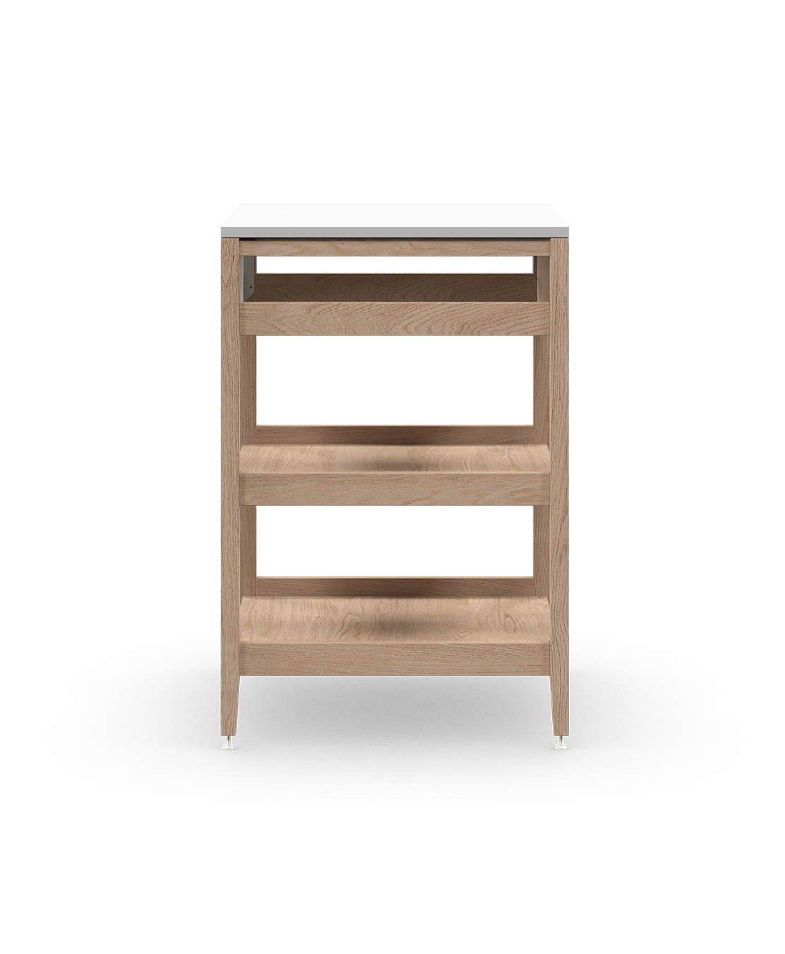 Salle de bain Balneo, vanité modulaire autoportante en chêne naturel avec pattes et poignées en métal blanc. Design épuré et fonctionnel.